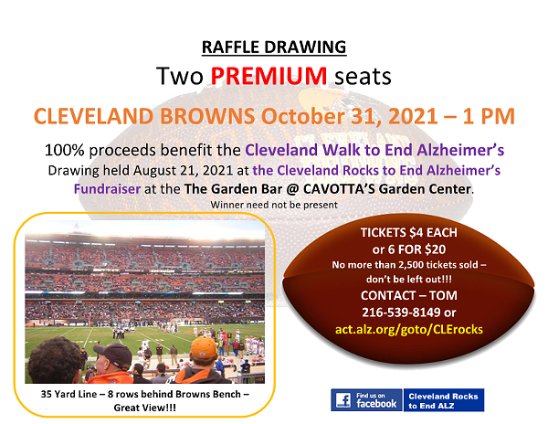 We're having a fundraiser to benefit the Walk to End Alzheimer's. You could win 2 premium Cleveland Browns Tickets for the October 31 game against the Pittsburgh Steelers! Seats located in row 8 on the 35 yard line!!!