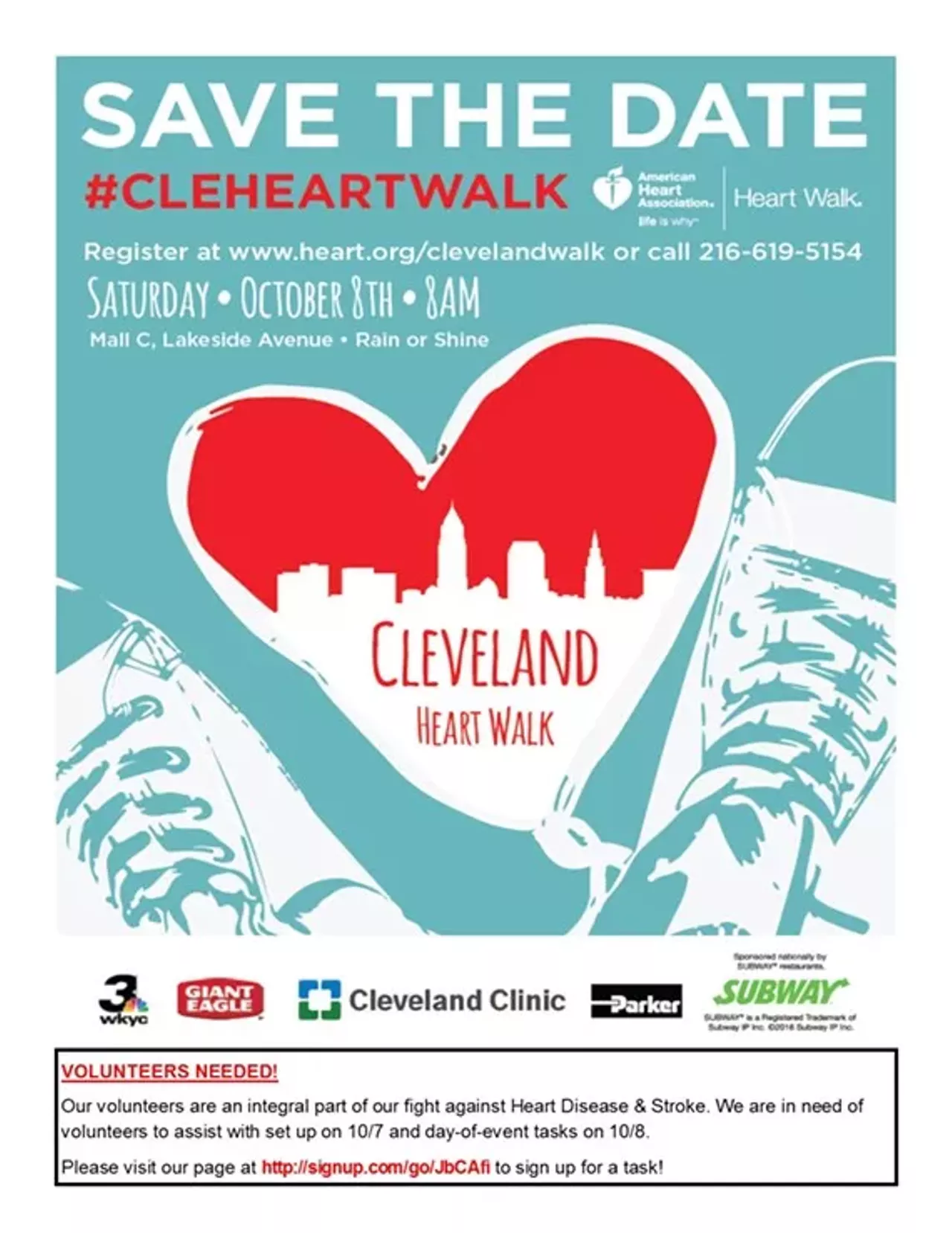 The American Heart Association is excited to announce the 2016 Cleveland Heart Walk will be held at Mall C, on Saturday, October 8th, 2016 – festival: 8am-10am and 1 & 3 mile walk: 10am. The Cleveland Heart Walk brings together 12,000+ attendees and raises over $1 million to fund research and life-saving techniques to lower the incidence of cardiovascular disease and stroke. For every $1 that is raised, $4 comes back to Northeast Ohio for research, education, and advocacy!