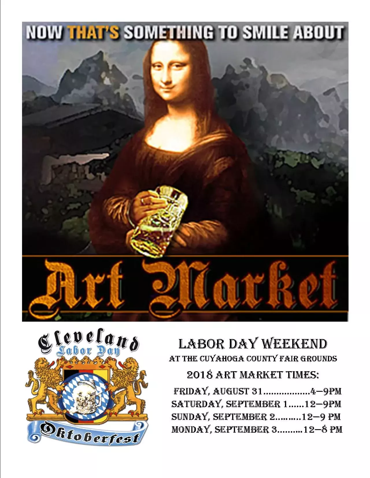 Art Market and Craft Market at the Cleveland Oktoberfest. Cuyahoga County Fairgrounds in Berea. Music – Food – Crafters – Fine Art & Family Activities! Friday, August 31st through Monday, September 3rd – Hours vary by day. Admission to Art/Craft Market is free - $12 admission to Fairgrounds