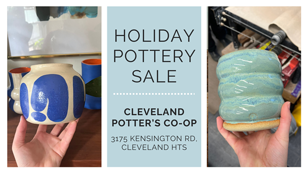 The Cleveland Potter’s Co-op is happy to announce its annual holiday pottery sale in early December. The pottery sale will include ceramic art made by its members, including mugs, bowls, planters, and much more. The pottery sale is scheduled for Friday, December 1st from 7-9 pm, Saturday Dec 2nd and Saturday Dec 9th 11am - 5pm, and Sunday Dec 3rd and Sunday Dec 10th from 11 am - 4 pm. Join us to purchase your holiday gifts, learn more about our members, learn about taking classes, and see our newly expanded studio.