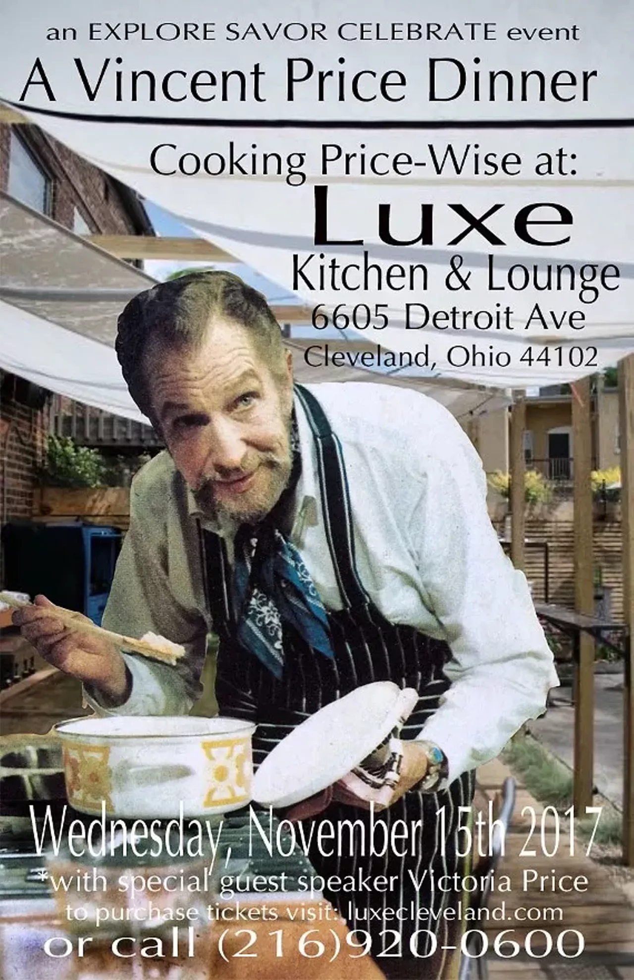 Tickets: $95.00 for four-course dinner w/wine pairing per person. Purchase a signed copy of "Cooking Price-Wise with Vincent Price", signed by Victoria Price for $20.00. Books must be purchased in advance. Seating is limited, and tickets are required. Luxe will be closed to public for this event. visit luxecleveland.com