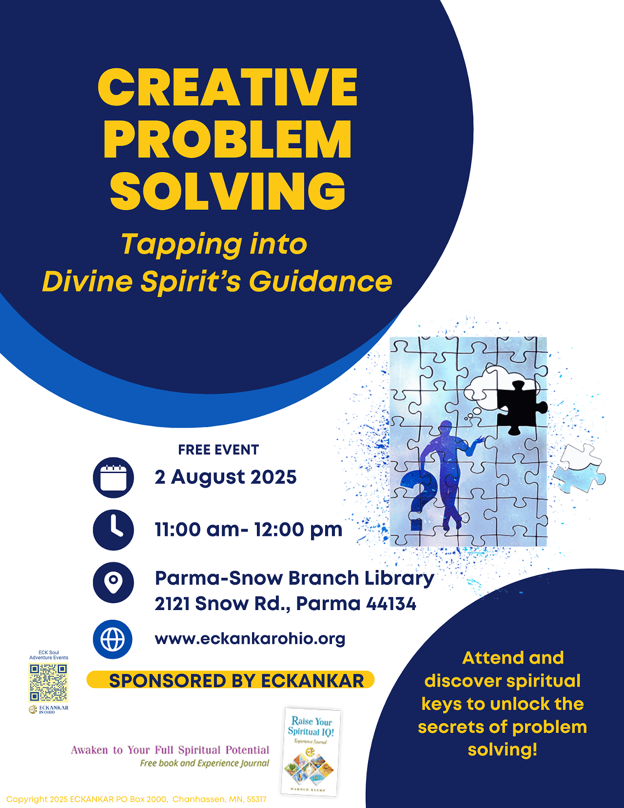 Problems? Problems! Why do we have so many? What causes them? Can we avoid them? Attend and get answers to these questions and more. Learn creative, time-tested techniques to work beyond symptoms to solutions, to kindle your creativity, and to tap into Divine Spirit’s guidance. Free event and free journal and book on ECK Wisdom on Solving Problems. Sponsored by ECKANKAR. Website: https://www.eckankarohio or email info@eckankarohio.org.