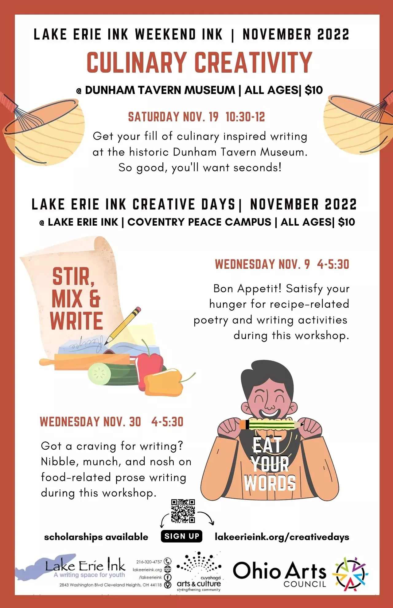Cost is $10 for each, but scholarships are available! Register at lakeerieink.org/creativedays