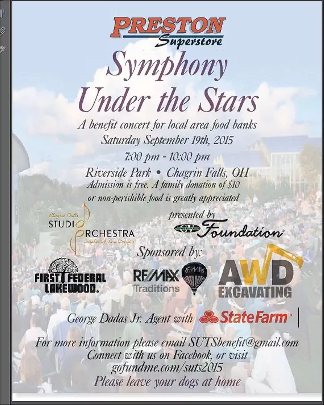A benefit concert featuring the Chagrin Falls Studio Orchestra in Riverside Park. The event is free but a 10 dollar family donation and some non-perishable food is greatly appreciated