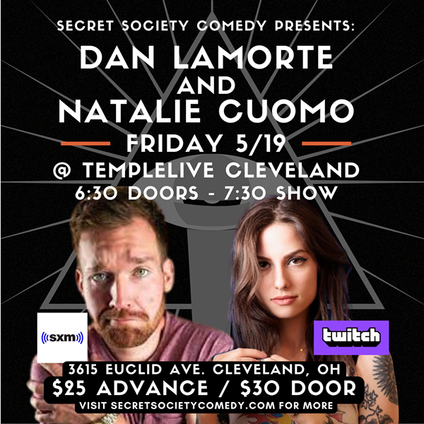Secret Society Comedy presents two of NYC's next generation of headliners on one show as Natalie Cuomo (Twitch) and Dan LaMorte (Sirius/XM) perform in an intimate "secret" space deep within the Masonic Auditorium. End your week with laughs as Northeast Ohio's nomad comedy club returns to the heart of one of Cleveland's most legendary event venues for a one-night special event. Get your ticket, give the password, have a few drinks with friends, and feel like part of a Secret Society as you discover stand-up comedy's best-kept Secrets. Doors at 6:30.