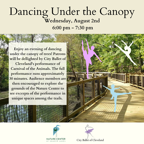 City Ballet of Cleveland and The Nature Center at Shaker Lakes present Dancing Under the Canopy on Wednesday, August 2, at 6:00 pm at The Nature Center at Shaker Lakes.