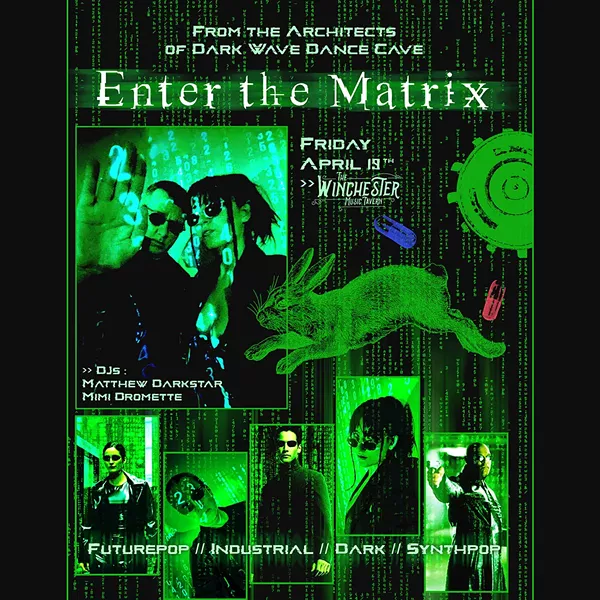 Dark Wave Dance Cave returns for a special night - Enter The Matrix! 💚 Come dressed as the “Matrix version” of yourself (if you like) and dance the night away in the ultimate club simulation! We’ll have custom lights and decor and even a photo backdrop where you can take pictures with Neo! The setlist this month will feature futurepop, industrial, synthpop, and more.