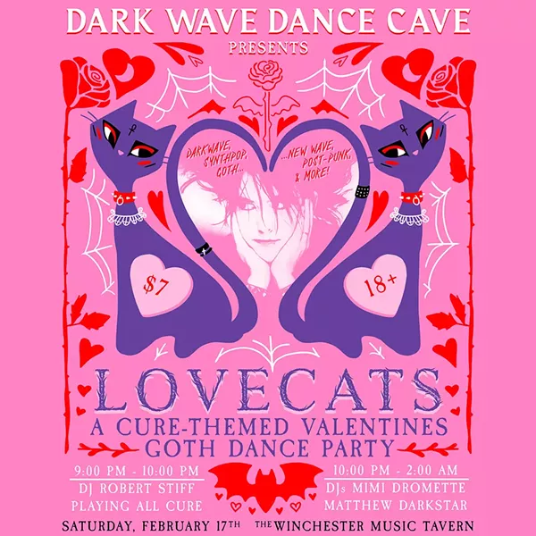 Dark Wave Dance Cave returns to The Winchester Music Tavern on Saturday, February 17th for LOVECATS - our Cure-themed Valentines night! Special guest DJ Robert Stiff will be spinning nothing but The Cure from 9pm-10pm. Then DJs Matthew Darkstar and Mimi Dromette will spin darkwave, new wave, synthpop, and goth tracks all night with an emphasis on love songs! 💕 Featuring photography by Extraordinaire Photos, a photo backdrop, decorations, and treats!