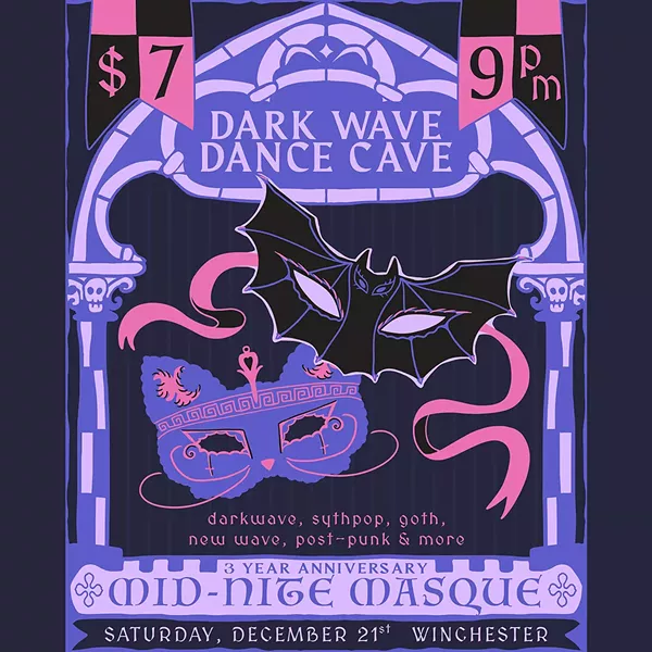 Dark Wave Dance Cave presents Mid-Nite Masque - a special night to put on your masquerade masks and spice up your fancy ball wear or your favorite club look! 🎠We’ll have a photo backdrop, themed cocktails, and a raffle for a gothy gift bag at midnight! 💜 (masks encouraged but not required)
