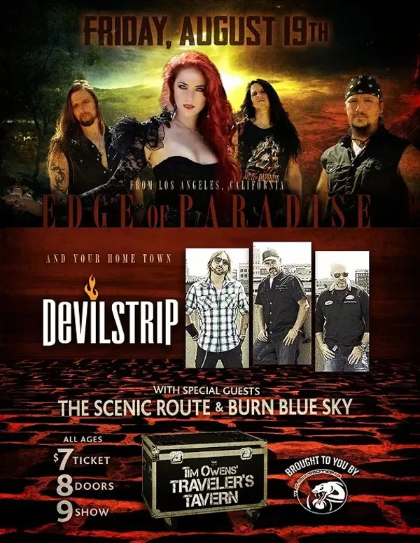 Edge of Paradise on tour in support of "Shade of Crazy" release. All the way from Los Angeles to share a night of killer Hard rock and roll with support from awesome local acts Devilstrip,The Scenic Route and Burn Blue Sky. Kick your weekend into high geer and rock out with this amazing night of music!! All ages show.