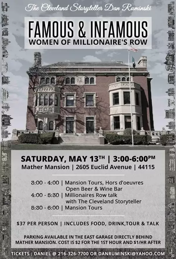 The Cleveland Storyteller, Dan Ruminski, returns to Mather Mansion, one of four remaining mansions on Millionaire's Row, to give the audience a personal look at the women who shaped the very streets we walk. His audience will hear surprising details and untold stories not found in any textbook that will draw parallels between Millionaires' Row heyday and the renaissance Cleveland is experiencing now. Tickets: $37 includes Beer & Wine and Heavy Hors d'oeuvres. Please contact Daniel W. Ruminski for reservations 216-326-7700 or email danruminski@yahoo.com All Major Credit Cards accepted. RSVP soon, as the event sells out fast.