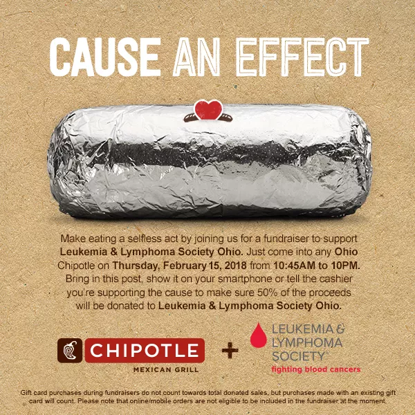 On Thursday, Feb. 15 from 10:45 a.m. to 10:00 p.m., half of all fundraiser sales at every Chipotle Mexican Grill in the Cleveland area will support the local Leukemia and Lymphoma Society (LLS) chapter.