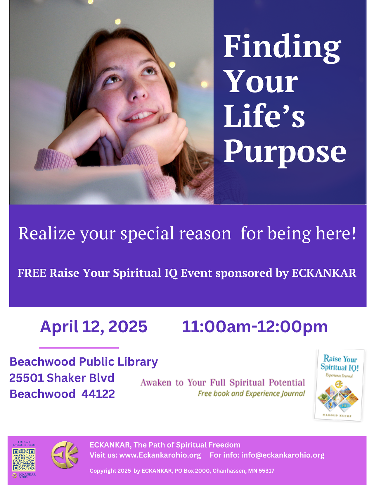 Have you ever wondered about the reason for living? Why you’re here in the world today? What’s it all about? There are answers! Attend this free event on Finding Your Life’s Purpose and start your journey to self-discovery. Learn spiritual techniques to go within to get your own answers. Inspiration, understanding, and help with taking the next steps of your life’s journey await you! Sponsored by ECKANKAR, a nonprofit organization dedicated to helping people achieve their highest spiritual potential. Free journal and books for attendees. For more information visit: www.eckankarohio.org or write to info@eckankarohio.org.