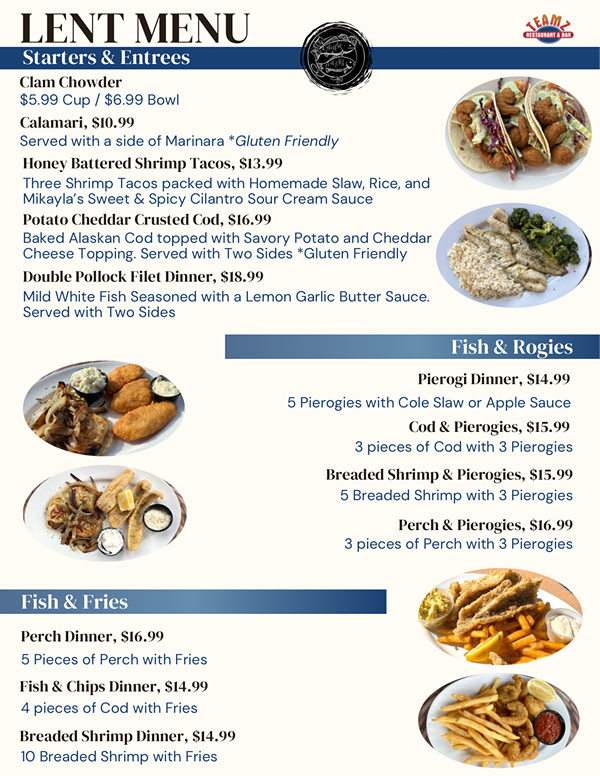 Lent has officially begun! Everyday you can grab delicious Lenten Specials off our new menu this season! 🐟🍤 This year we’re featuring Calamari, Honey Battered Shrimp Tacos, Potato Cheddar Crusted Cod, and Double Pollock Filet Dinner.