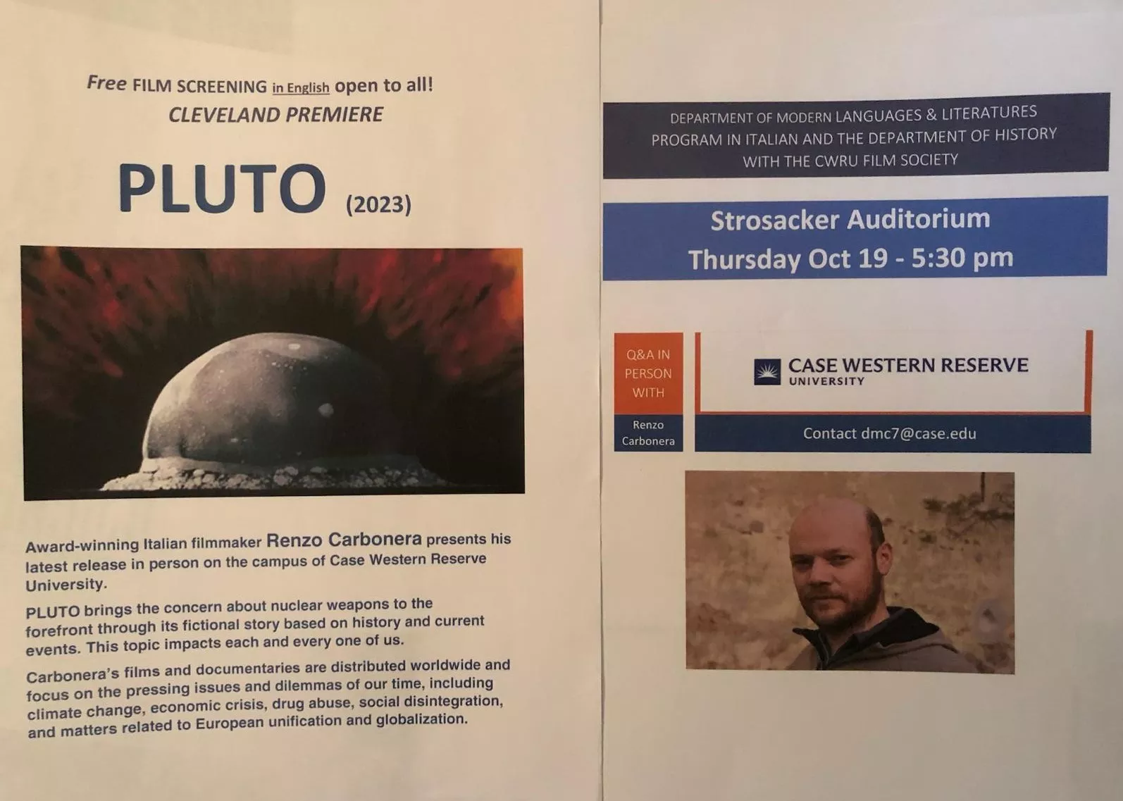 Thursday, October 19 at 5:30 pm in Strosacker Auditorium see the Cleveland premiere of PLUTO (2023) by award-winning Italian filmmaker Renzo Carbonera. IN ENGLISH about a topic that impacts everyone. Carbonera will be present in person to hold Q&A afterward.