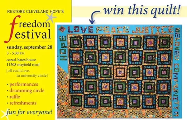Fun for the whole family, drumming circle, storytelling, music and a drawing to win a beautiful handmade quilt. Actors Nina Domingue and Robin Pease will perform stories about Cleveland's role in the Underground Railroad. Kevin Richards and Sheela Das of Roots of American Music will play.