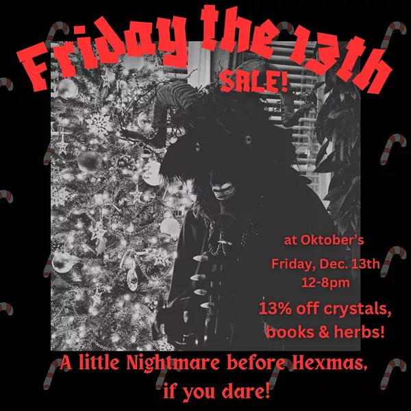 Friday the 13th in December? Don’t mind if I do! Stop in to Oktober’s for 13% off crystals, books and herbs ALL DAY LONG! We have a bunch of rad holiday gifts for your favorite witch, creepy gifts for your spooky friend or bones for your goblin roommate hiding under their bed! (Tell them ‘hey’ from us) We got you covered! Stop in for a spell and see your favorite neighborhood witches! See you soon!