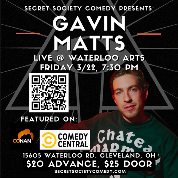 Secret Society Comedy is proud to present headliner Gavin Matts (Bill Burr Presents: The Ringers on Comedy Central) at Waterloo Arts, the perfect venue to attend a "secret" comedy show where you can celebrate life's wins, have a unique date night, check out local art, and break up the weekend routine to laugh the night away. Gavin is one of the fastest rising comedians in NYC, and is a regular on Comedy Central and at the world renowned Comedy Cellar, so if you've ever wanted to say, "I saw them 'when,'" this is your 'when.'