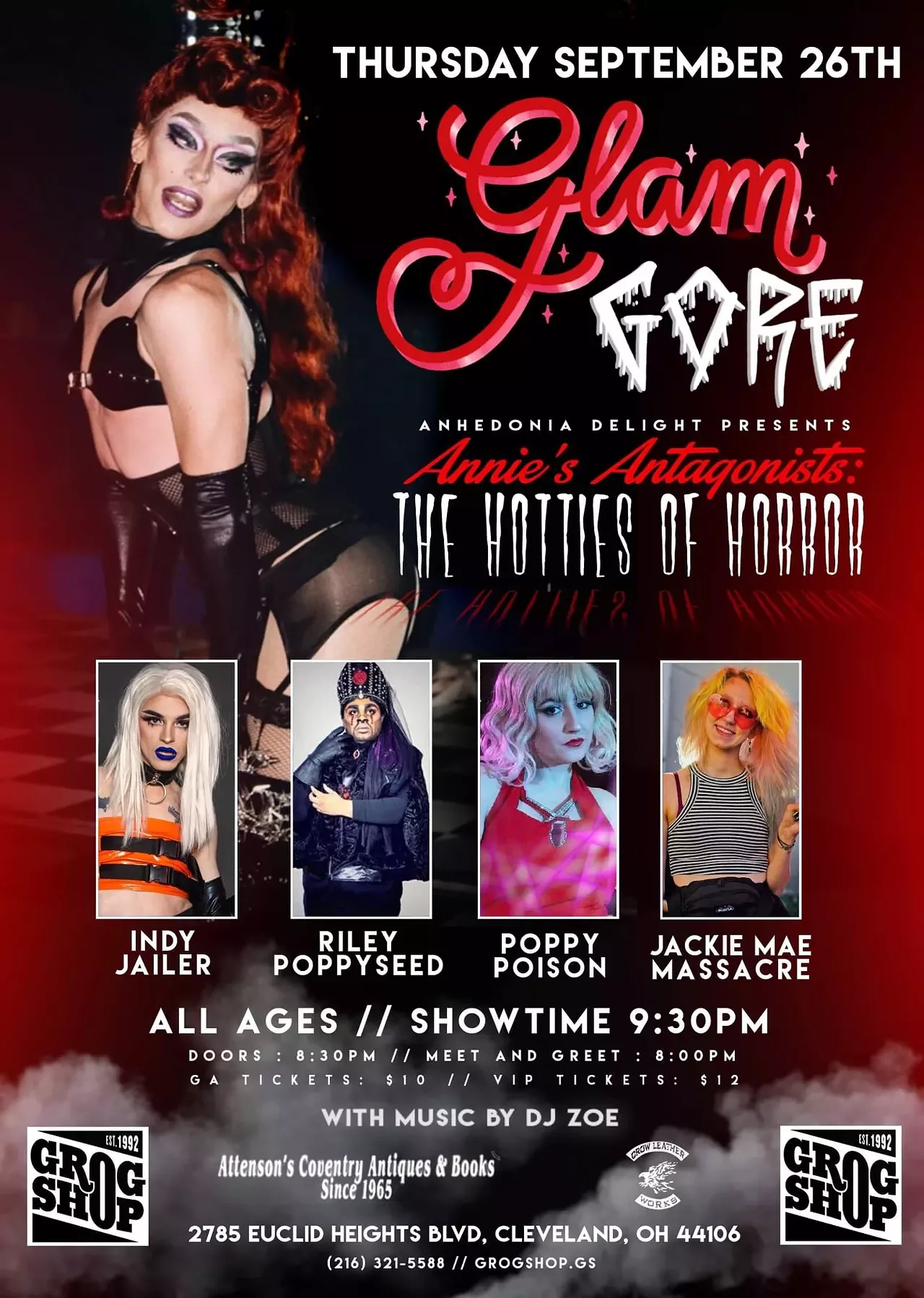 Each month, GlamGore, a drag show at the Grog Shop, features a variety of performance artists under one roof. The shows include everyone from "beauty queens" to "drag monsters." Tonight's show theme is Hotties of Horror with performers Anhedonia Delight, Poppy Poison, Indy Jailer, Riley Poppyseed and Jackie Mae Massacre. Tickets cost $10, or $12 for VIP tickets that give you early bird access to the Grog starting at 8 p.m. and a special photo opportunity/meet-and-greet with the cast. For general admission ticket holders, the doors open at 8:30 p.m. DJ Zoë will attend to the turntables. (Niesel)