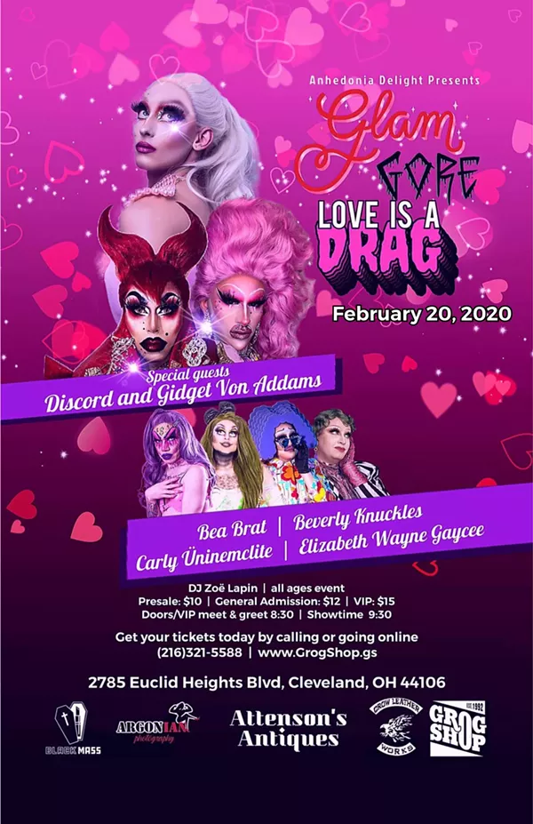 Each month, GlamGore, a drag show at the Grog Shop, features a variety of performance artists under one roof. The shows include everyone from "beauty queens" to "drag monsters." Tonight's show centers on the theme "Love Is a Drag." Beverly Knuckles, Be a Brat, Carly Uninemclite, Elizabeth Wayne Jaycee, and Discord Addams & Gidget Von Addams are on the bill. Tickets cost $10 in advance, $12 at the door, or $15 for VIP tickets that include a special photo opportunity/meet-and-greet with the cast at 8:30 p.m. The show starts at 9:30 p.m. DJ Zoë will attend to the turntables. (Niesel)