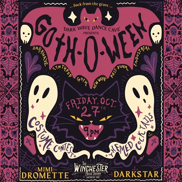 Dark Wave Dance Cave is back this October, and we're celebrating our move to The Winchester Music Tavern with a huge Halloween bash! We'll have The Winchester decked out with decorations and candy, with a costume contest at midnight, themed drink specials, and a spooky photo backdrop! DJs Mimi Dromette and Darkstar will be spinning the coolest and spookiest darkwave, synthpop, goth, post-punk, and new wave dance tracks all night!