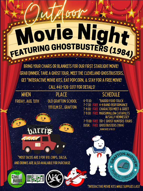 Join us at the Old Grafton School for a family-friendly community event. Barrio food truck will be at the event with plenty of delicious tacos starting at 6:00 pm! Starting at 7:00 pm, take pictures with the Cleveland Ghostbusters and create marshmallow catapults with Sally Hennessey from the Lorain County OSU extension office. Once the sun goes down, enjoy an interactive experience with a nostalgic film. We will provide snacks and bug spray. Please bring your own chairs and blankets. Rain date is Saturday, September 18.