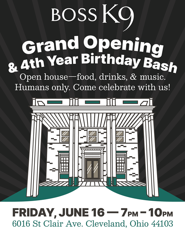 Boss K9’s opening party will take place at 6016 St. Clair Ave. on Friday, June 16th, between 7PM and 10PM. Guests are also warmly invited to attend a Rainbow Ribbon Cutting Ceremony in partnership with Plexus LGBT & Allied Chamber of Commerce at 6:30PM. Please come tour and celebrate our new home with us, and enjoy a night of food, drink, music, and dancing with our community. We’ll also be celebrating Boss K9’s 4th birthday at this open house. While we look forward to welcoming our canine friends after our move, please note that this will be a human-only party.
