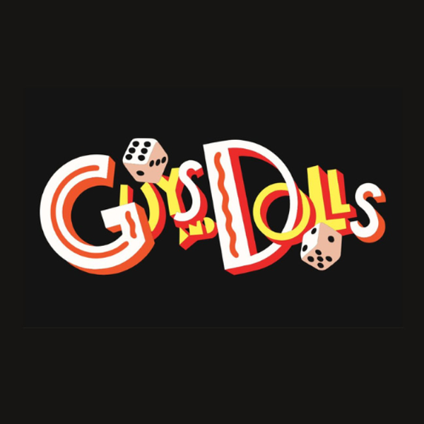 Guys and Dolls promo image in an art deco stylized font with dice surrounding it
