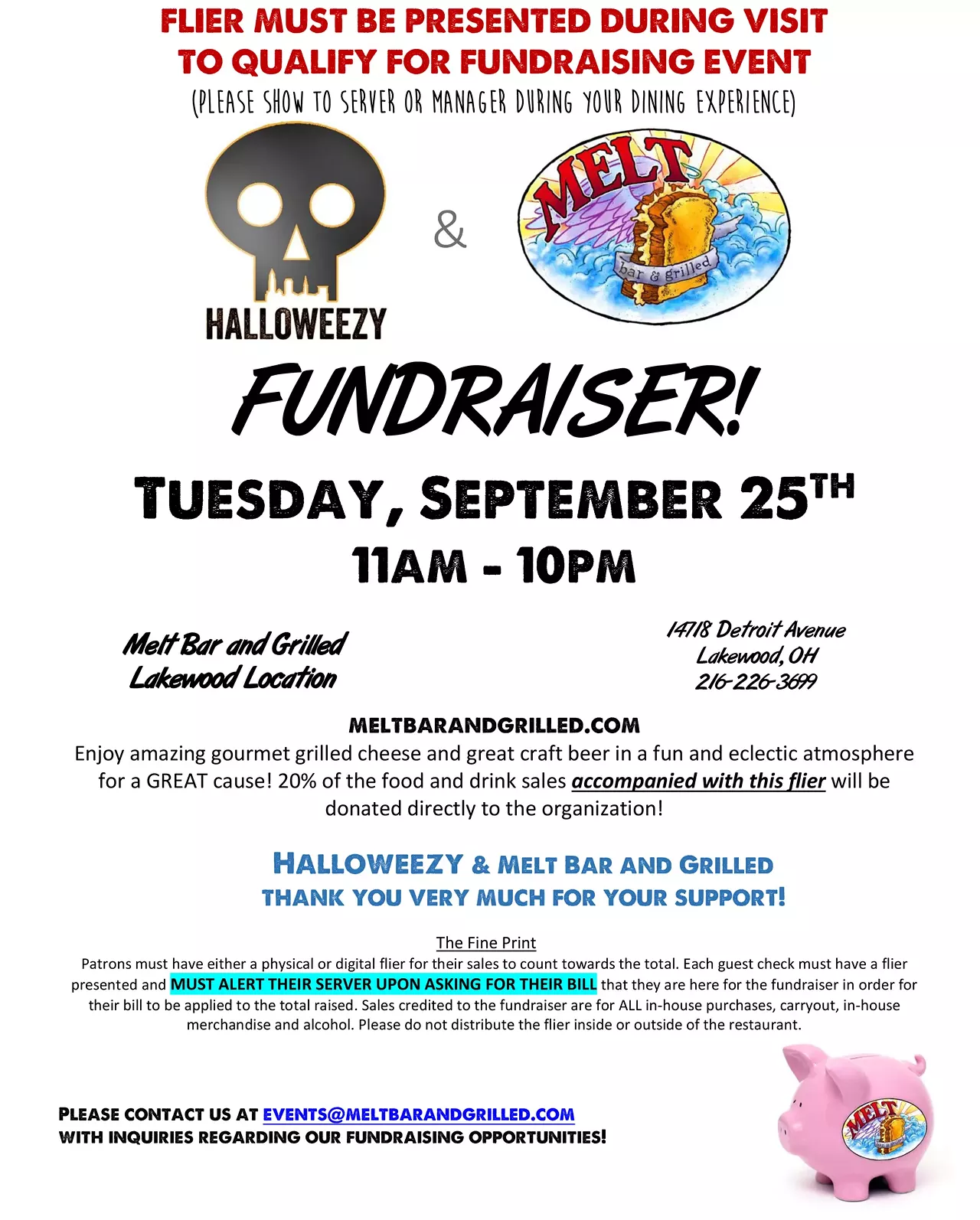 Tuesday, September 25th from 11:00 a.m. to 10:00 p.m. please join Halloweezy at Lakewood Melt Bar and Grilled for our fundraiser! Please show your sever this flyer to help benefit out awesome event!