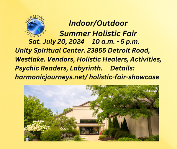 Harmonic Journeys Indoor/Outdoor Summer Holistic Fair, Sat. July 20. 10-5. Unity Spiritual Center, 23855 Detroit Rd., Westlake. Off I90, just west of Clague. Vendors, Holistic Healers, Psychic Readers, Speakers, Activities, Meditation Garden, Walk the largest Outdoor Labyrinth in Ohio! Admission $5. Details: https://www.harmonicjourneys.net/holistic-fair-showcase