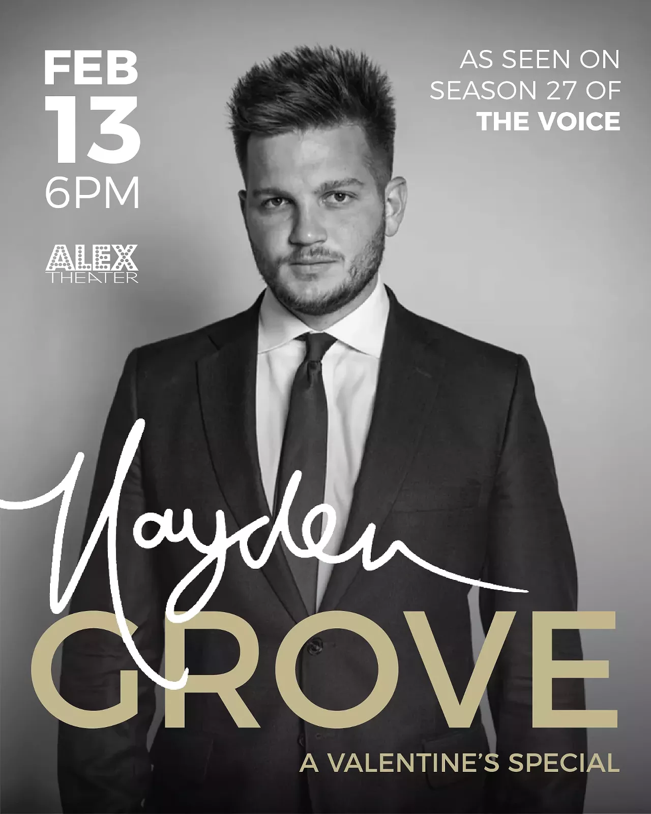 Fall in love with the Great American Songbook all over again. Join us for an enchanting evening as Cleveland’s own Hayden Grove takes the stage at Alex Theater. Fresh off Season 27 of The Voice, Hayden brings his signature velvety vocals and modern swing style to our Valentine’s Special — a performance designed to stir the soul and warm the heart.