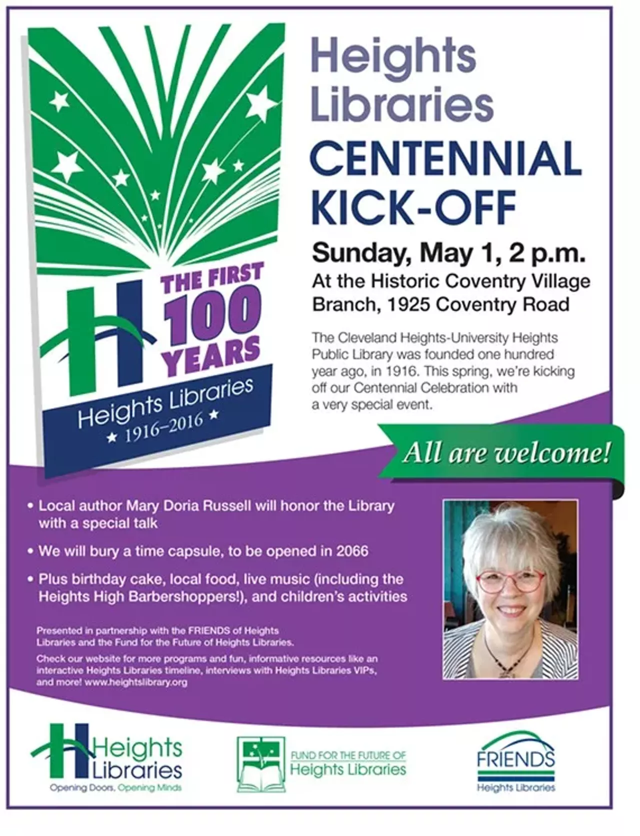 The historic Coventry Village branch is the setting for our 2016 Centennial Celebration Kick-Off. Local author Mary Doria Russell will honor the Library with a special talk, we will bury a time capsule, and enjoy birthday cake, live music, and children’s activities. All are welcome!