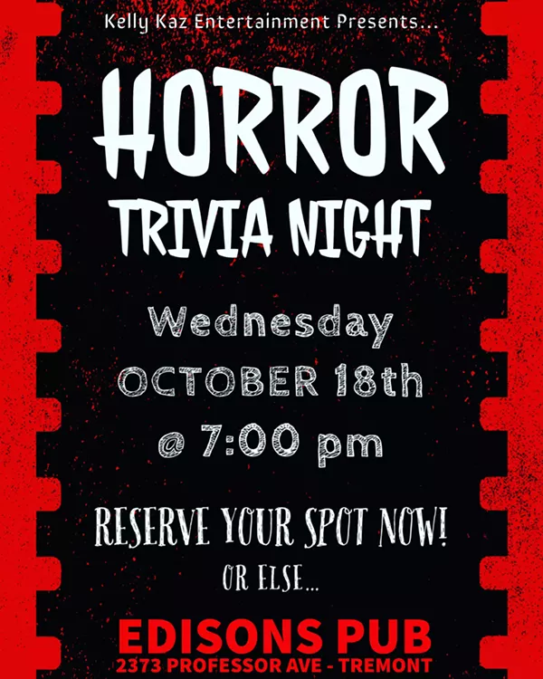 Join us for a spine-chilling evening of Horror Trivia at Edison’s Pub! Get ready to test your knowledge of all things scary and supernatural. Whether you're a horror movie buff or just love a good scare, this event is perfect for you! TOP TEAMS WIN GIFT CARDS!
