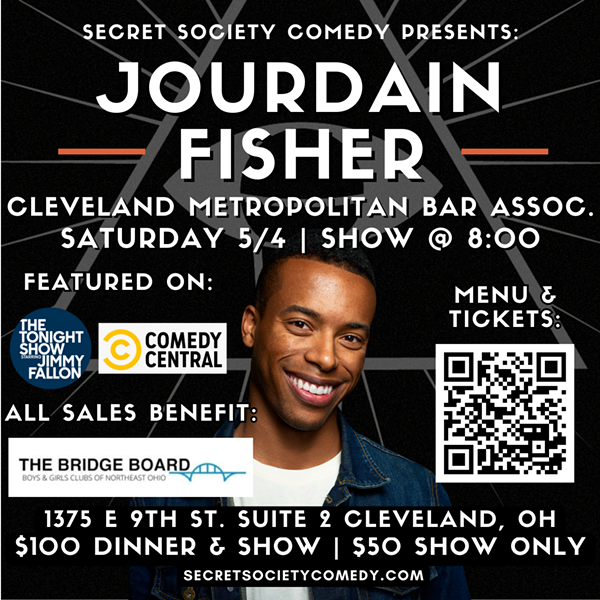 Secret Society Comedy and The Bridge Board are proud to present NYC-based headliner Jourdain Fisher at The Cleveland Metropolitan Bar Association in an event where proceeds support The Boys And Girls Clubs Of Northeast Ohio. Laugh the night away for a good cause with dinner and drinks. Jourdain has performed on Comedy Central and The Tonight Show, and was a finalist on StandUp NBC. If you've ever wanted to say, "I saw them 'when,'" this is your 'when.' Dinner + show: $100, show only: $50. Purchase 6 tickets and get 2 bottles of champagne. Doors 6:30, dinner 7:00, show 8:00.