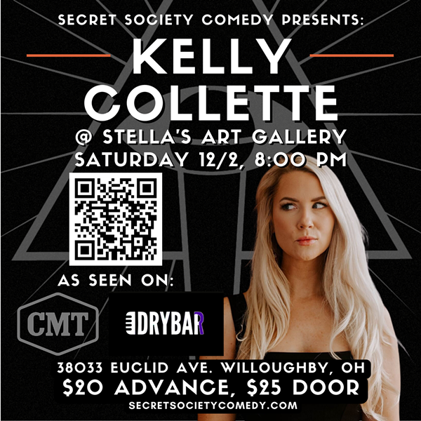 Kelly Collette, a CMT Next Big Comic finalist, performs LIVE at our pop-up comedy club in downtown Willoughby, so if you need a laugh to end your week on a high note, this is the place to go. Each week, we host the nation's best touring, regional, and local comedians providing a unique comedy club experience in different spaces with different vibes, and Stella's Art Gallery is the perfect venue to attend a "secret" comedy show where you can celebrate life's wins, have a unique date night, or just break up the typical weekend routine with laughs and local art.