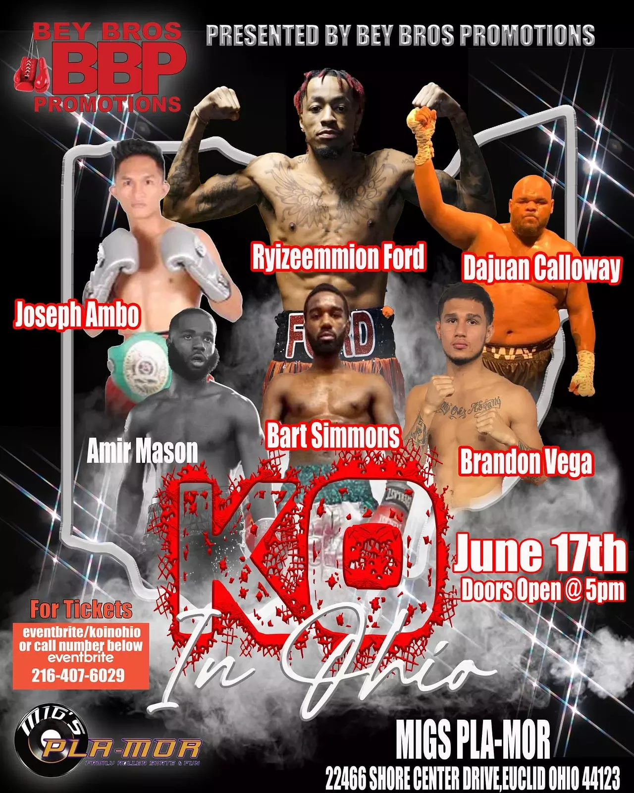 Bey Bros and MIG's PLA-MOR collaborates to bring the best professional boxing matches to the Cleveland area. Come check out Ryizeemmion Ford, Amir Mason, Dajuan Calloway, Brandon Vega, and more. Line up subject to change.