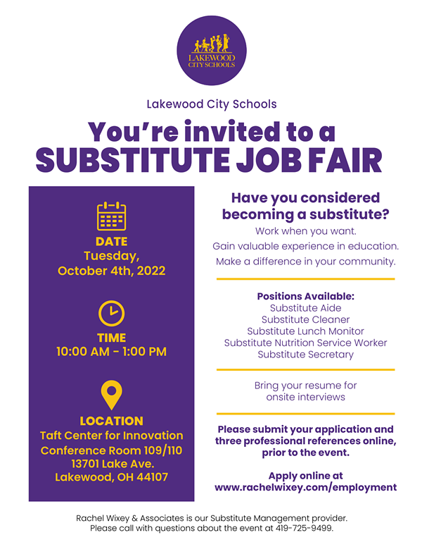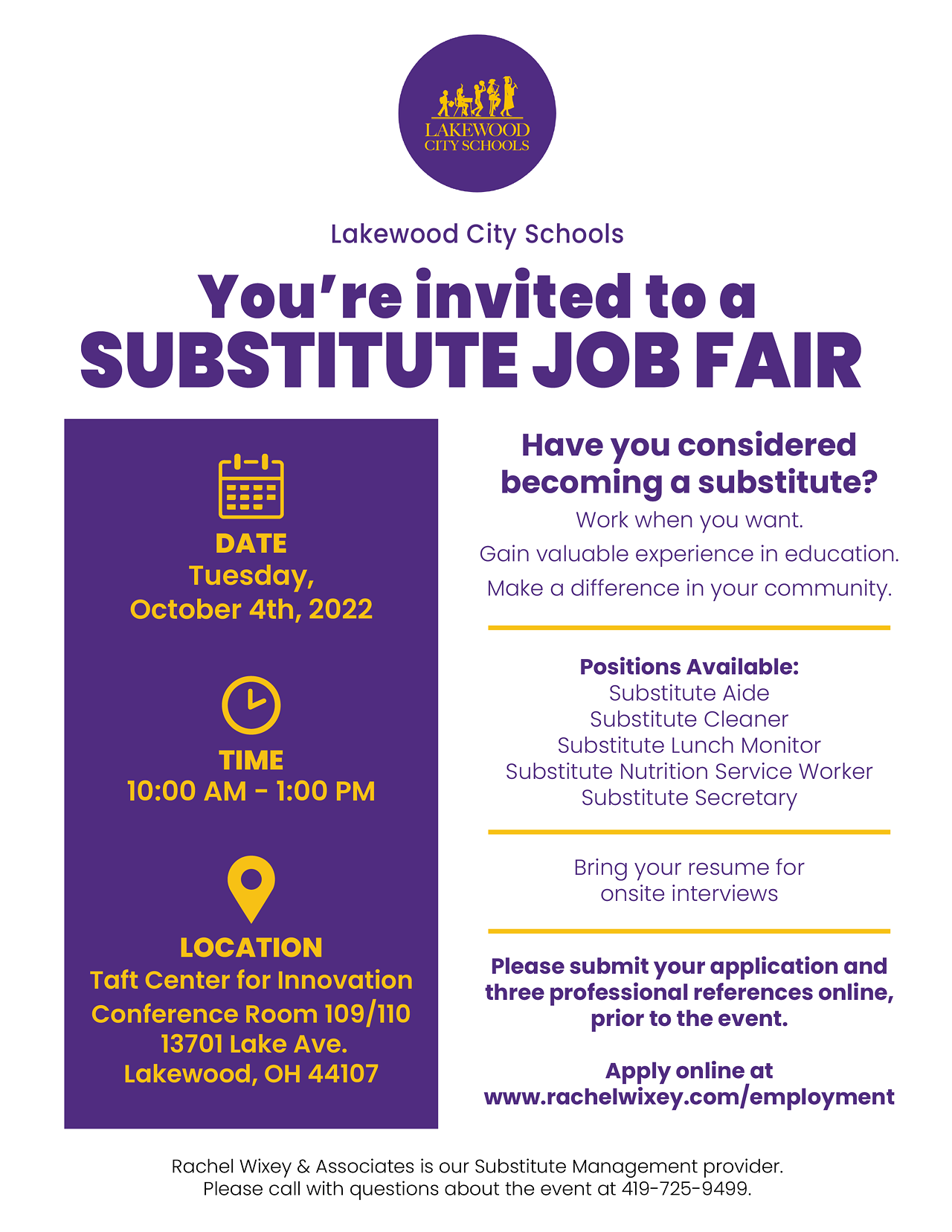 Lakewood City Schools invites you to attend a Substitute Job Fair for the 2022-23 school year. We’re seeking individuals who are interested in supporting the education process, have experience working with children and want to impact the lives of young people in the schools and their community. The job fair will be held at the Taft Center for Innovation(Conference Room 109/110) from 10AM-1PM on Tuesday, October 4th. We’re hiring Substitute Aides, Substitute Lunch Monitors, Substitute Lunch Monitors, Substitute Food Service Workers, and Substitute Secretaries. Apply online at www.rachelwixey.com/employment. Call with any questions about the event at 419-725-9499.