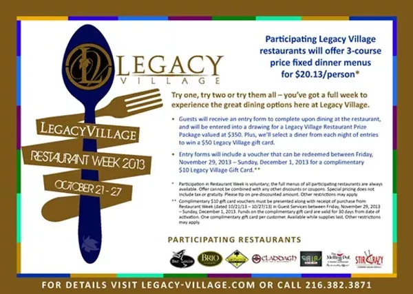 For more information visit http://www.legacy-village.com/fallrestaurantweek13 or call 216.382.3871.