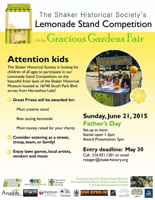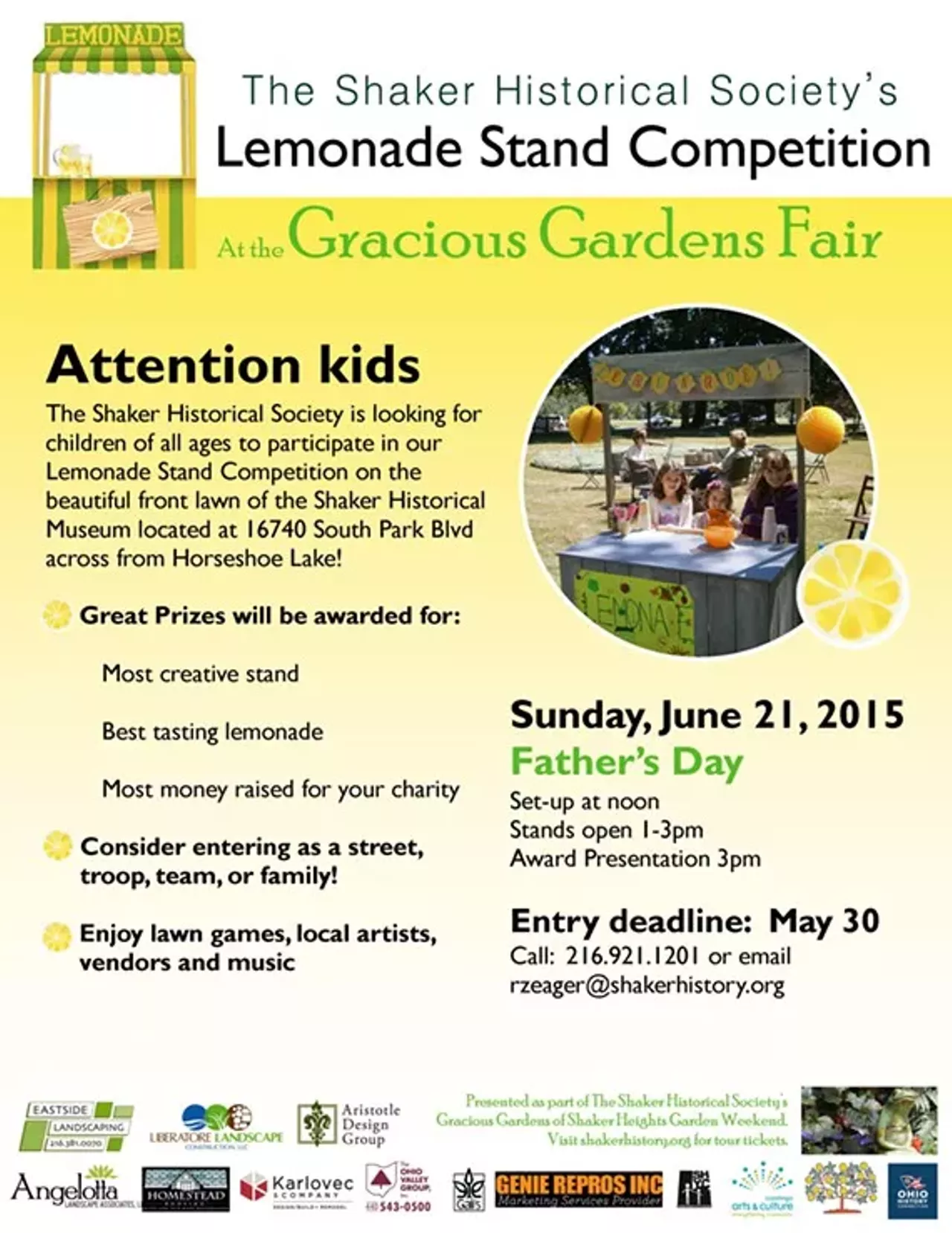 As part of the Gracious Gardens weekend, the Shaker Historical Society is looking for creative children of all ages to participate in a lemonade stand competition on the grounds of the Shaker Historical Museum on Sunday, June 21st from 12-3pm.
