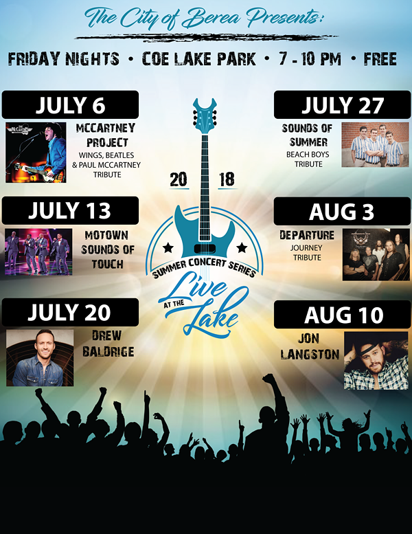 Live at the Lake is a new concert series launched by the City of Berea at the beautiful, newly renovated Coe Lake Park. Coe Lake has long been a gathering place for our community and the new amphitheater allows for six consecutive free concerts every Friday night from July 6-Aug. 10. There will be amazing local food trucks, beer/wine as well as nonalcoholic beverage sales.