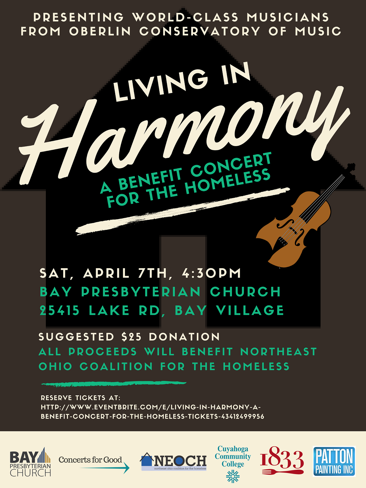 Join the battle against Cleveland homelessness and enjoy music performed by world-class musicians from Oberlin Conservatory of Music at the same time! Eleven classical and jazz musicians will present a special concert on April 7th at 4:30pm at Bay Presbyterian Church in Bay Village, Ohio. A free-will donation is accepted at the door or on Eventbrite. All proceeds will benefit Northeast Ohio Coalition for the Homeless.