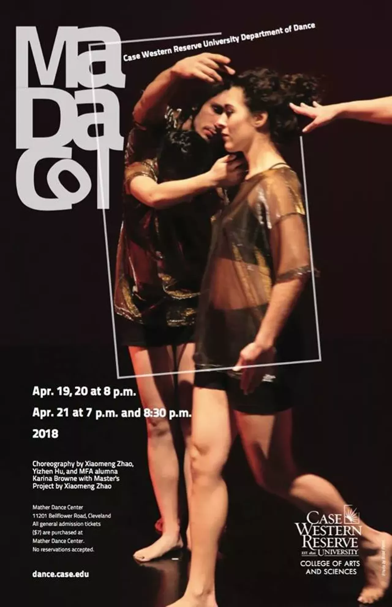 The Department of Dance at Case Western Reserve University is pleased to announce this Spring’s production of MaDaCol (Mather Dance Collective). Performances are April 19 & 20 at 8 p.m., and April 21 at 7 p.m. and 8:30 p.m.