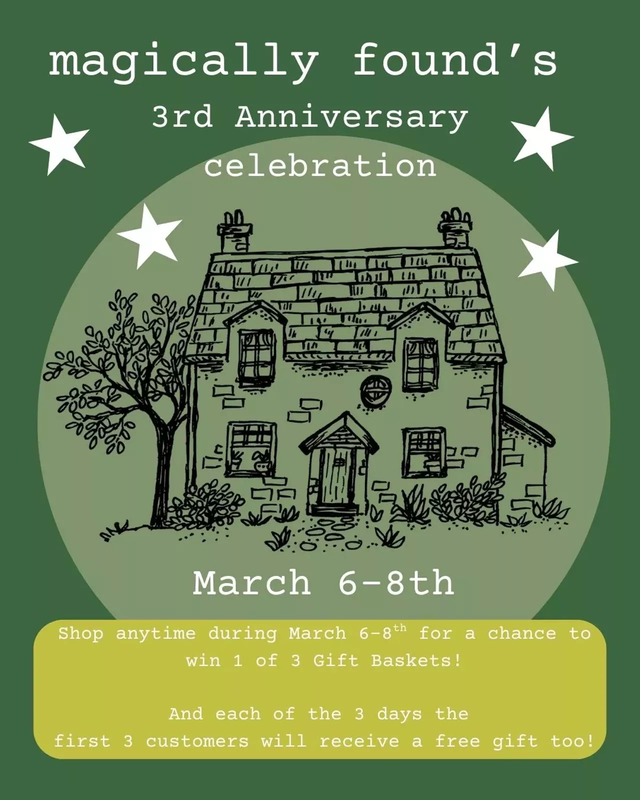 Magically Found is celebrating our 3rd Anniversary! Shop during the weekend of March 6th-8th to be entered to win one of our 3 gift baskets. And each of the 3 days we will be giving out a gift to our first 3 customers!