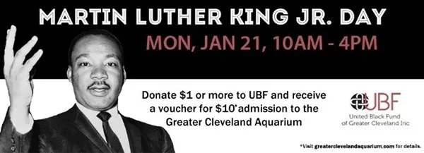 The Greater Cleveland Aquarium and the United Black Fund of Greater Cleveland Inc. have teamed up for a special fundraising event today in honor of Martin Luther King Jr. Day. From 10 a.m. to 4 p.m., each guest who chooses to donate $1 or more to UBF receives same-day discounted $10 aquarium admission. Last year, nearly 2000 guests giving to UBF, a grant-making organization that provides financial assistance to agencies that "both empower and address challenges facing Greater Cleveland's African American community." This year, the Aquarium will highlight African Americans influential in the fields of marine science and scuba diving throughout its galleries on MLK Day. (Niesel)