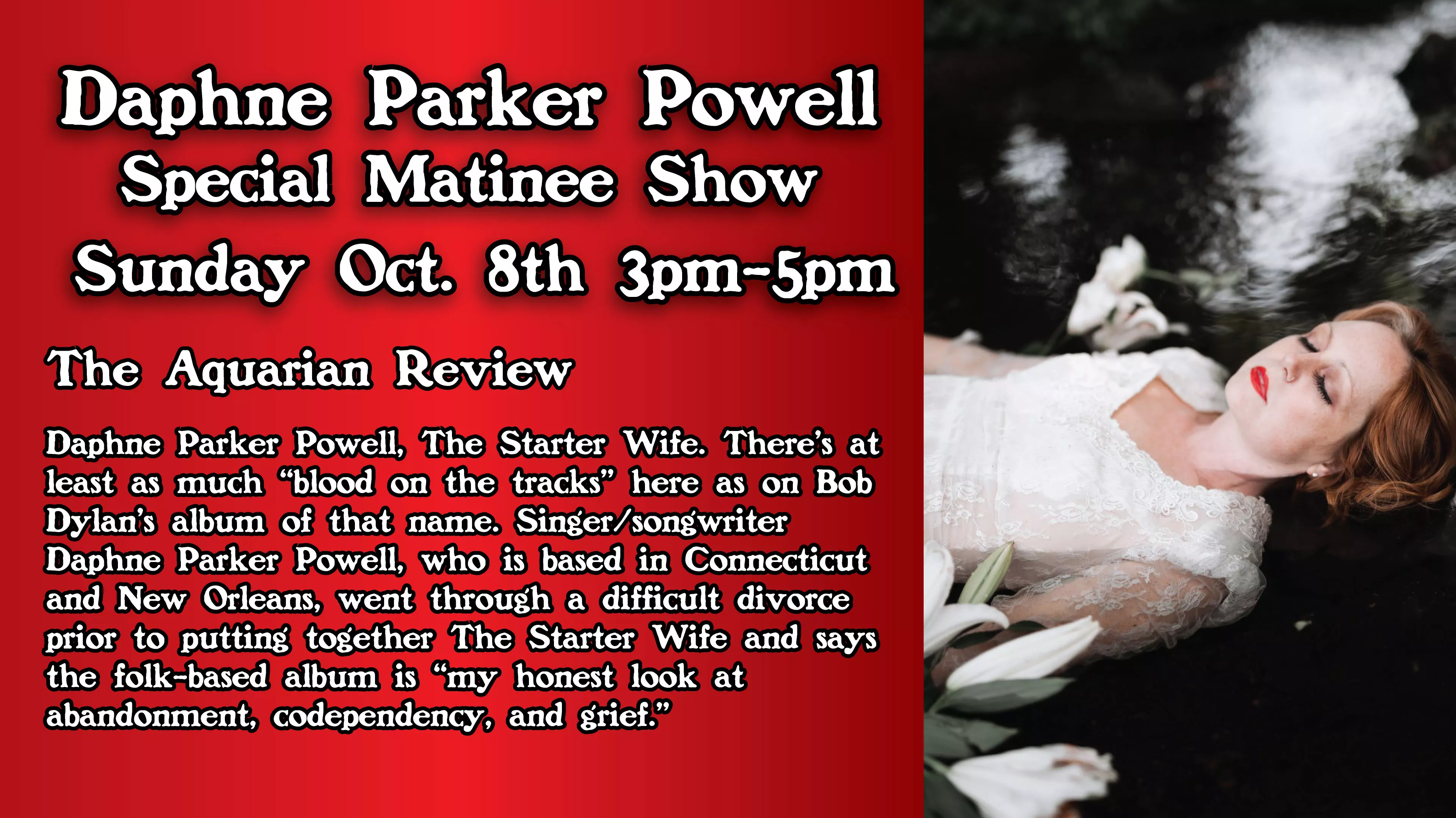 Come and see singer songwriter Daphne Parker Powell as she does a quick tour in the region. This is a special Sunday afternoon performance. Feel free to bring in snacks, or order in from Lu's Pizza, Check Please Cafe, or Don MeXcal. Playing selections from her latest release, The Starter Wife. Only 15 minutes from Great Northern Mall in Grafton!