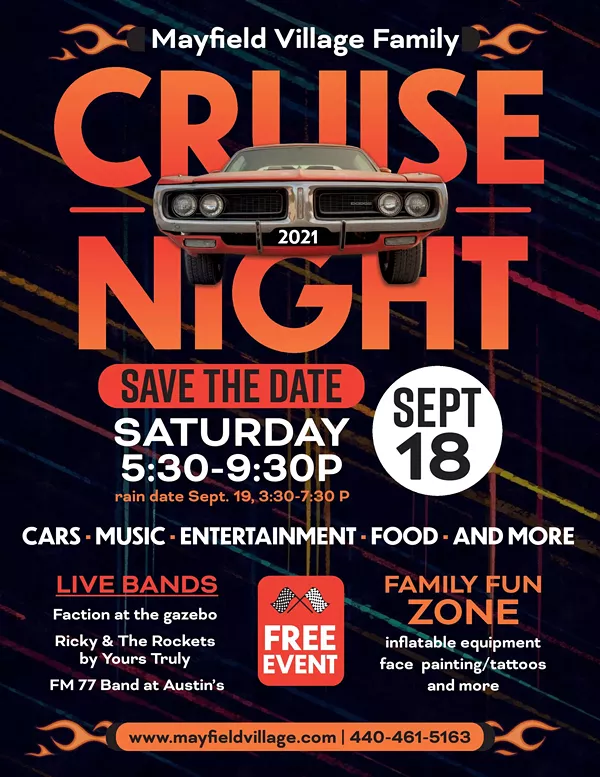 The best car show in Northeast Ohio is back again along with the awesome Family Fun Zone. The family activities and entertainment will include animals, bounce house, face painting and more! Music from the 60s - Ricky & The Rockers, 70s - FM77 & 80s and today - FACTION Cleveland! Come Cruise down Wilson Mills with us!