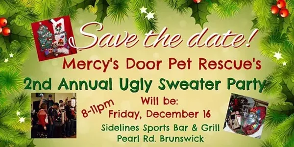 Join Mercy's Door Pet Rescue for our Ugly Sweater Party! The party is Friday, December 16th from 8:00 P.M. to 11:00 P.M. at Sidelines Bar and Grill: 1165 Pearl Road Brunswick, Ohio 44212. Tickets include drinks, dinner, and dessert. There will be dozens of raffle baskets, a DJ, a photo booth, and more! Plus of course, the ugly sweater contest! ALL proceeds from this night go towards the rescuing and rehabilitating of local dogs in need of a second chance. For info on our rescue, visit http://www.mercysdoorpetrescue.org/.