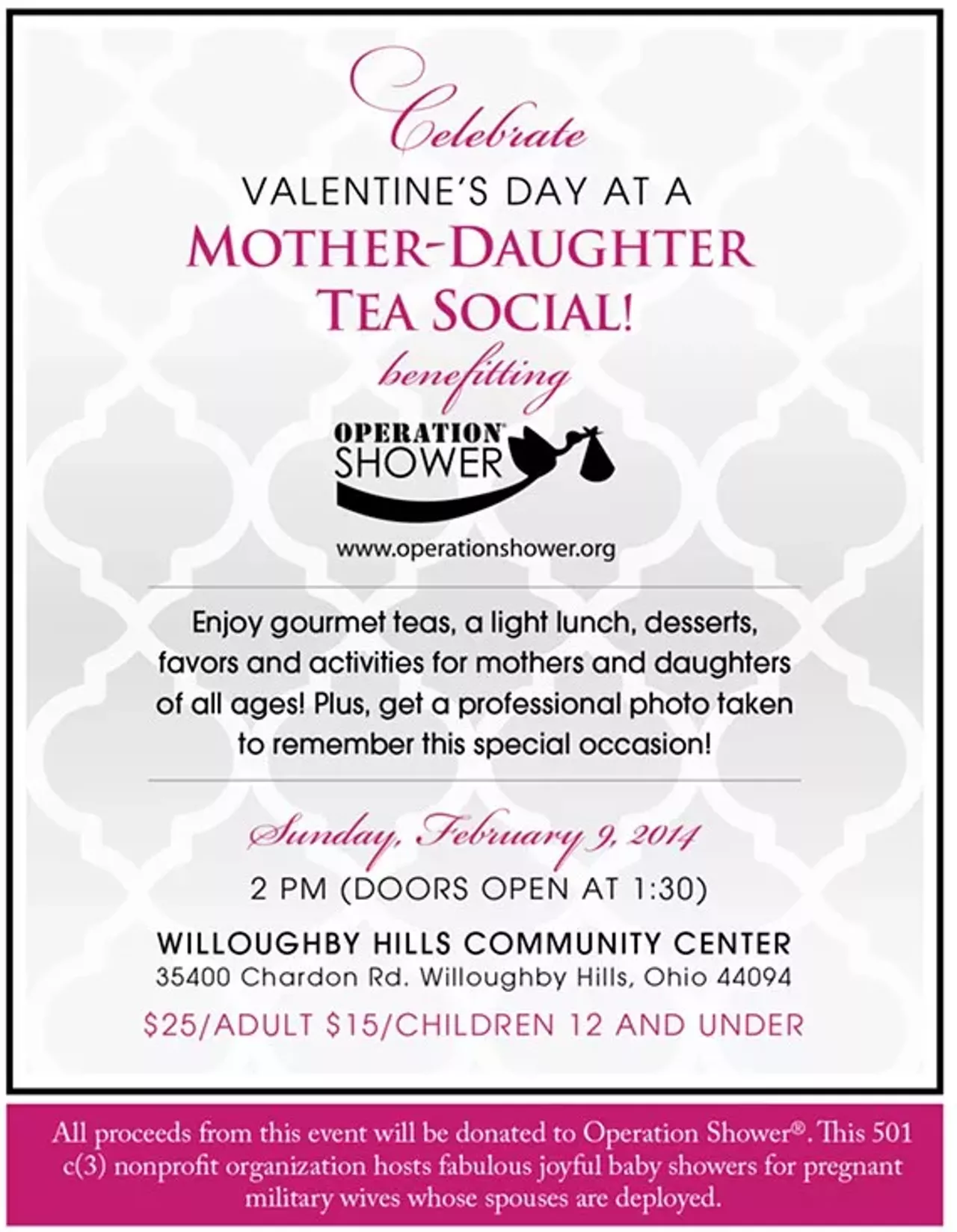All proceeds from this event will be donated to Operation Shower. This 501 c(3) nonprofit organization hosts fabulous over-the-top baby showers for pregnant military wives whose spouses are deployed.