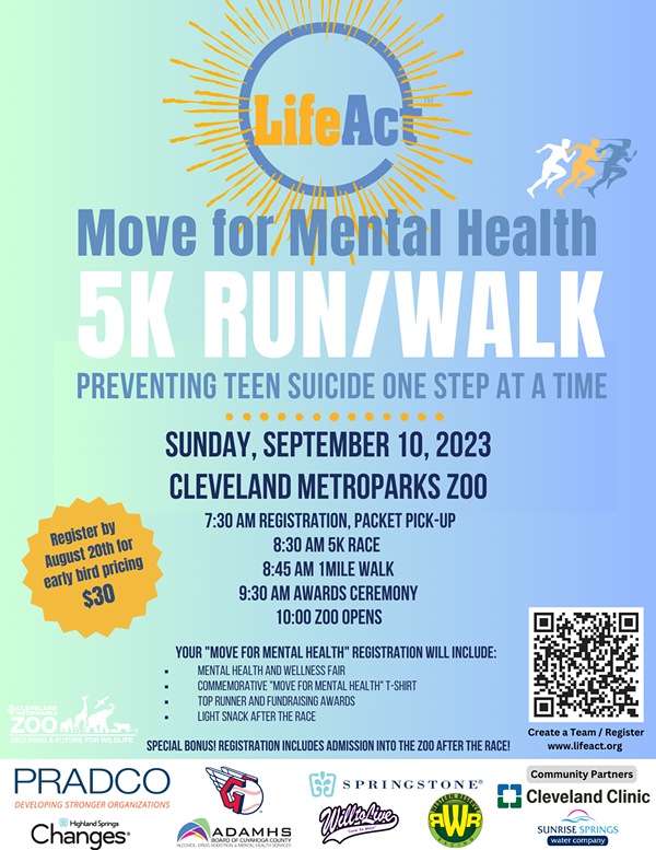Join LifeAct at the “Move for Mental Health” 5k/Walk at the Cleveland Metroparks Zoo on Sunday, September 10, 2023 (World Suicide Prevention Day!) Help us prevent teen suicide one step at a time!