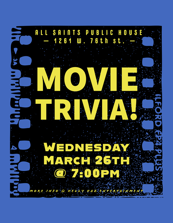 Do you freaking love movies?! Well, you’re in luck! We are doing MOVIE trivia at All Saints Public House with your favorite host Kelly Kaz! There will be 6 rounds with 5 questions each, including a music round - name that tune style! Grab a team or even play by yourself and show off all that sweet sweet movie knowledge!